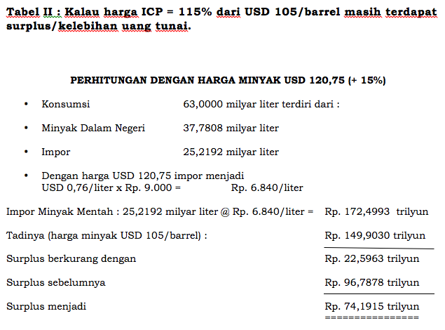 Bahwa keyakinan itu sama sekali keliru terlihat dari perhitungan di bawah, yang masih menghasilkan surplus sebesar Rp. 74,1915 triyun dalam hal harga ICP menjadi USD 120.75