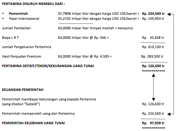 Seperti kita ketahui, harga bensin premium Rp. 4.500 per liter, sehingga pemerintah merasa merugi sebesar Rp. 2.009 per liternya (Rp. 6.509 – Rp. 4.500). Dengan kata lain, pemerintah merasa memberikan subsidi kepada rakyat Indonesia yang membeli bensin premium sebesar Rp. 2.009 untuk setiap liternya.